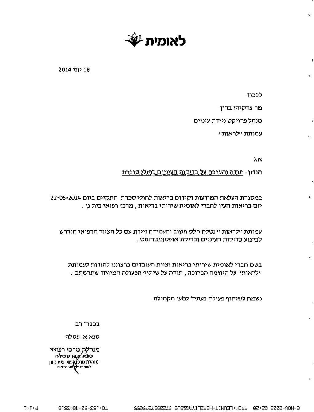 ברצוני להודות לעמותת "לראות", העמותה לחקר בריאות העין ומניעת עיוורון בישראל. אשתי, בת 79, חולת סוכרת שנים רבות ורתוקה לבית ואין ביכולתה ובאפשרותה לצאת מהבית. לבדיקת מצב העינים והראיה יש משמעות מיוחדת וחיונית, באשר המחלה עלולה להביא לעיוורון. זה זמן רב ולמרות מאמצים רבים לא הצלחנו למצוא עבור אשתי פתרון לבצוע בדיקת עיניים, שכה הכרחית לסובלים ממחלתה.