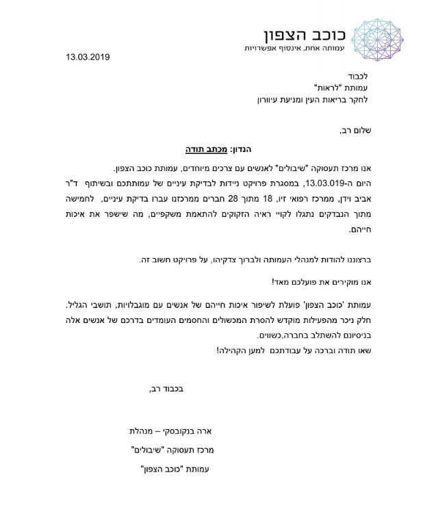 אנו אסירי תודה לעמותה. עמותת "לראות" ראויה לתודה לתמיכה ועזרה ובמיוחד להערכה רבה על פעולה חיונית התנדבותית זו.